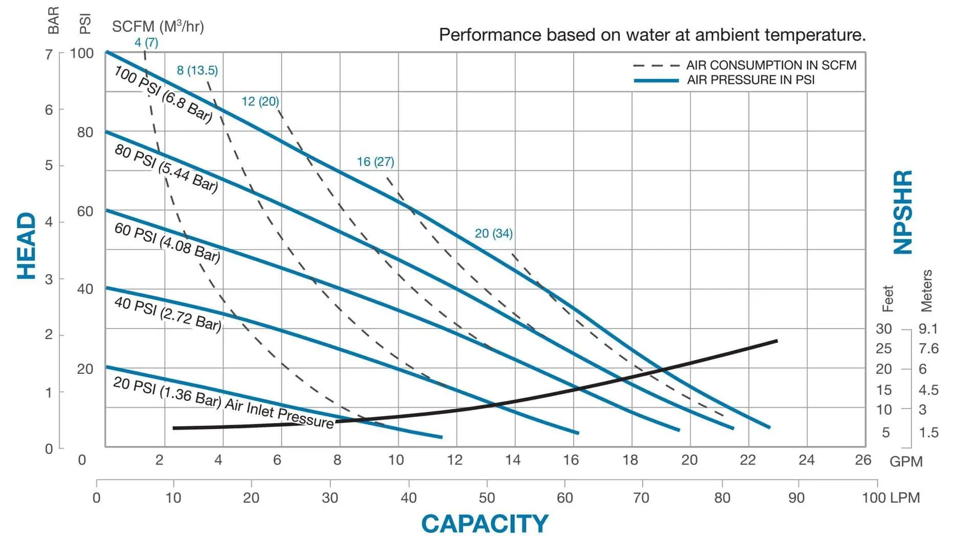 | Presión mínima de entrada de aire: | 10 psig (0.7 bar) - PTFE |