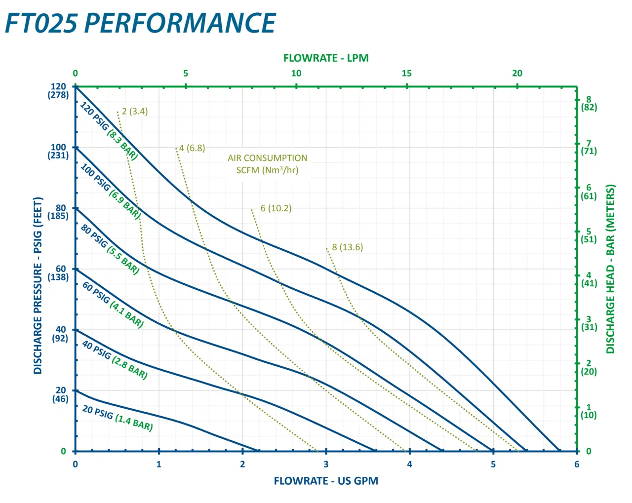 | Presión mínima de entrada de aire: | 10 psig (0.7 bar) - PTFE |