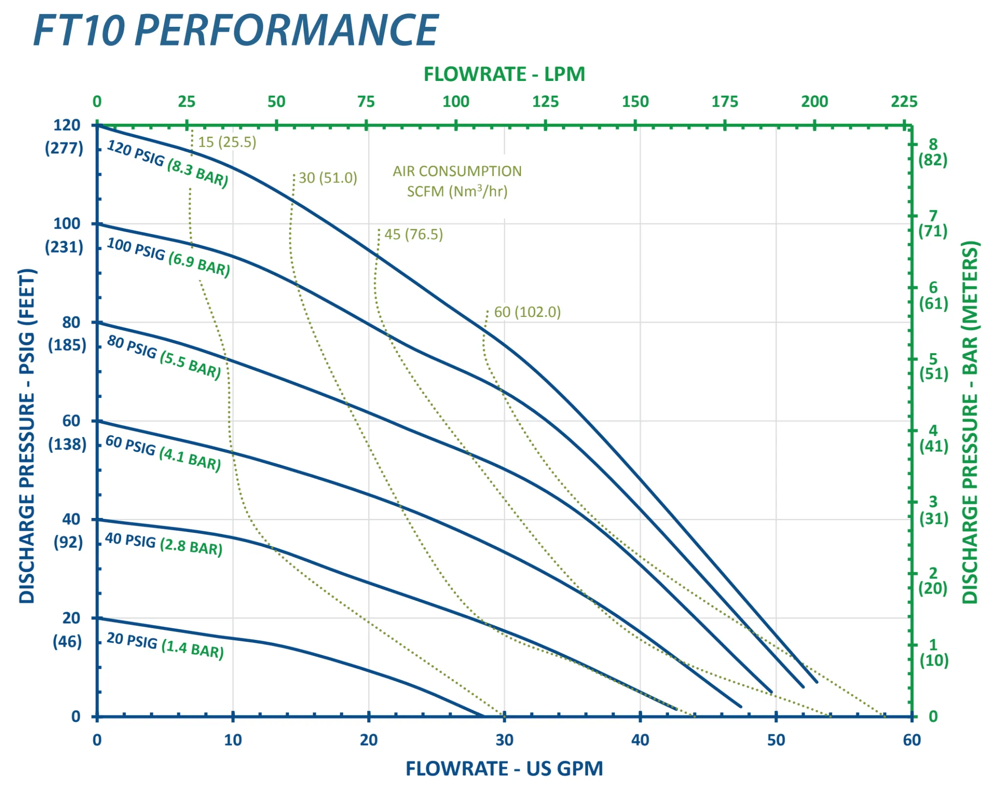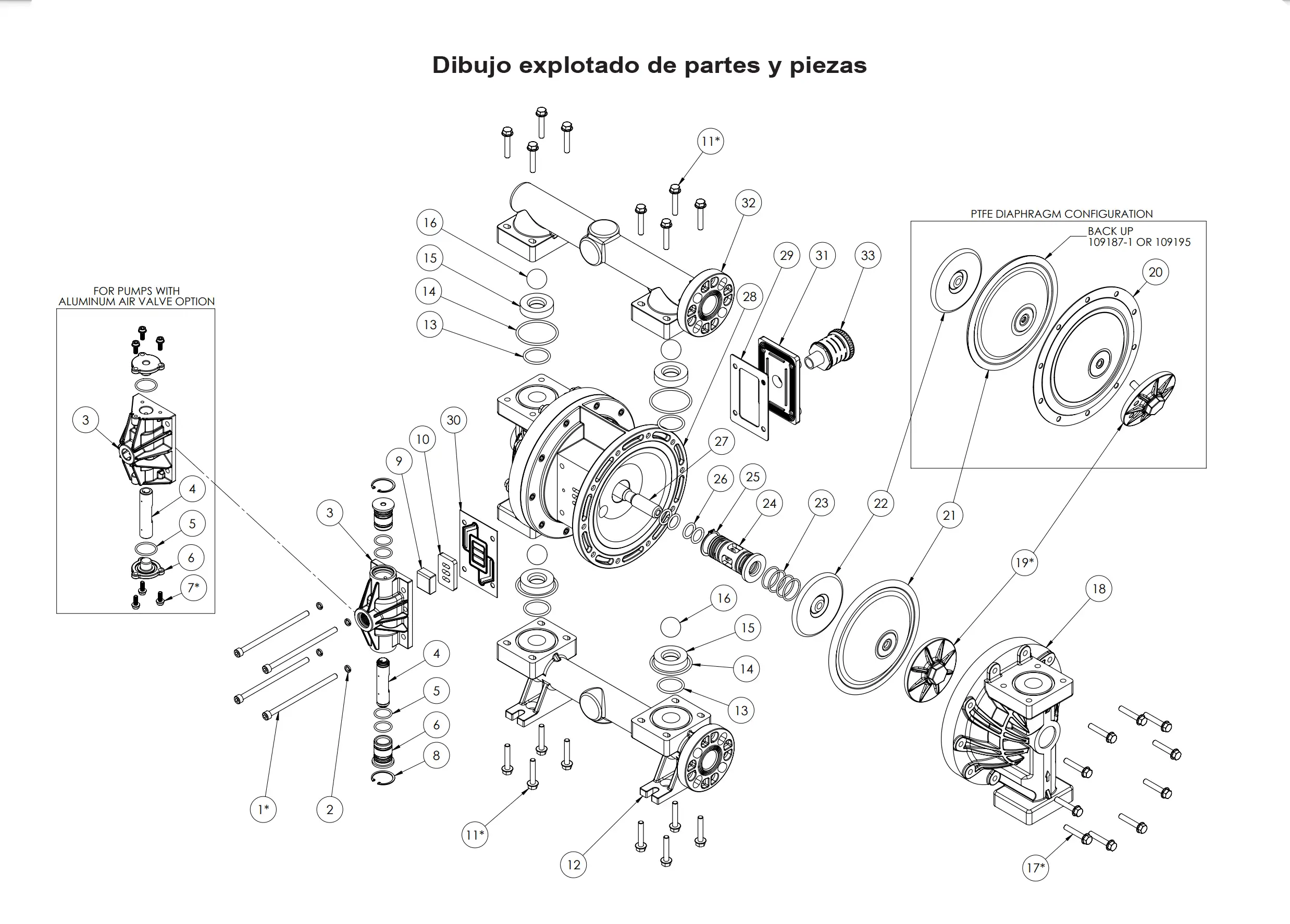 | Presión mínima de entrada de aire: | 10 psig (0.7 bar) - PTFE |