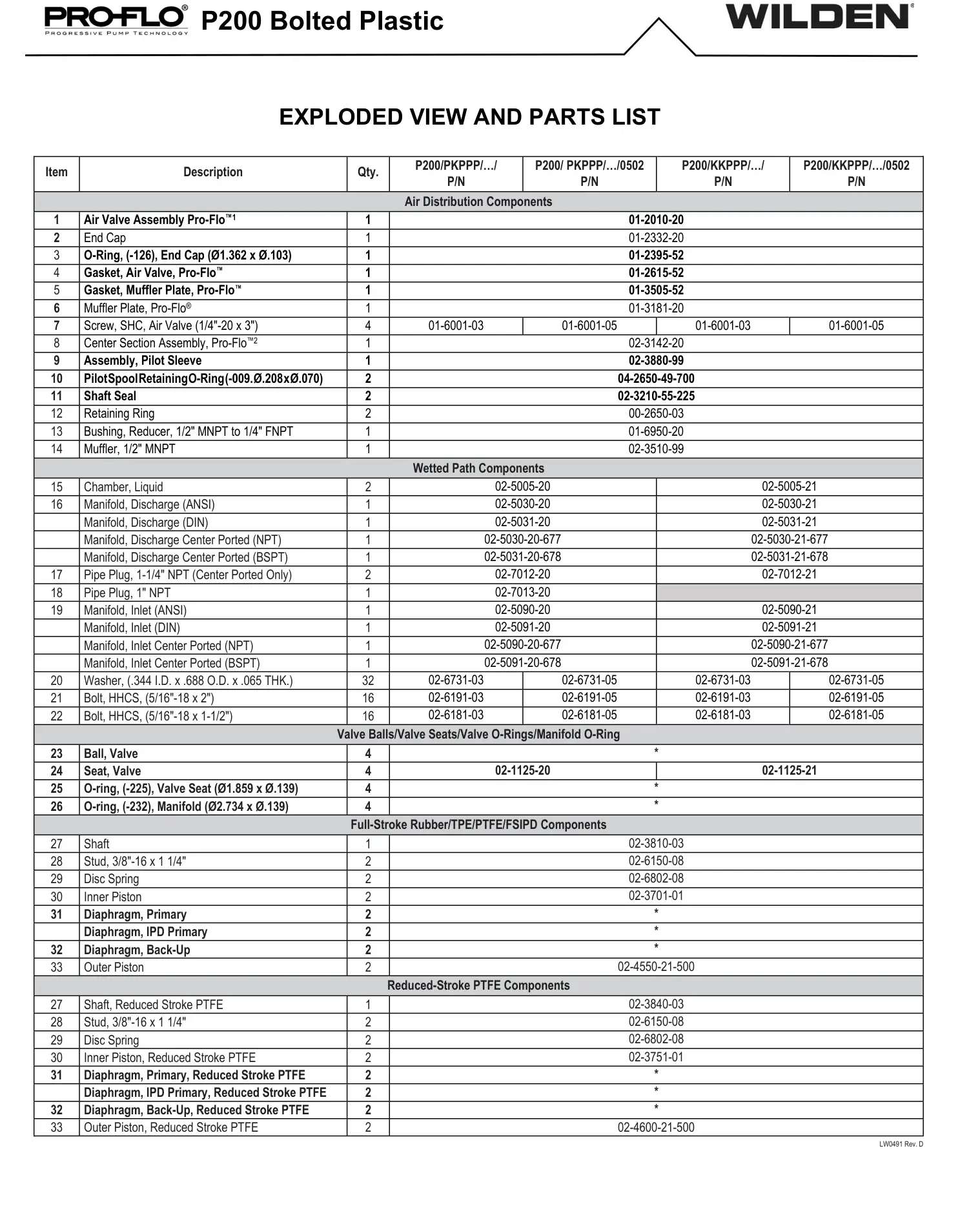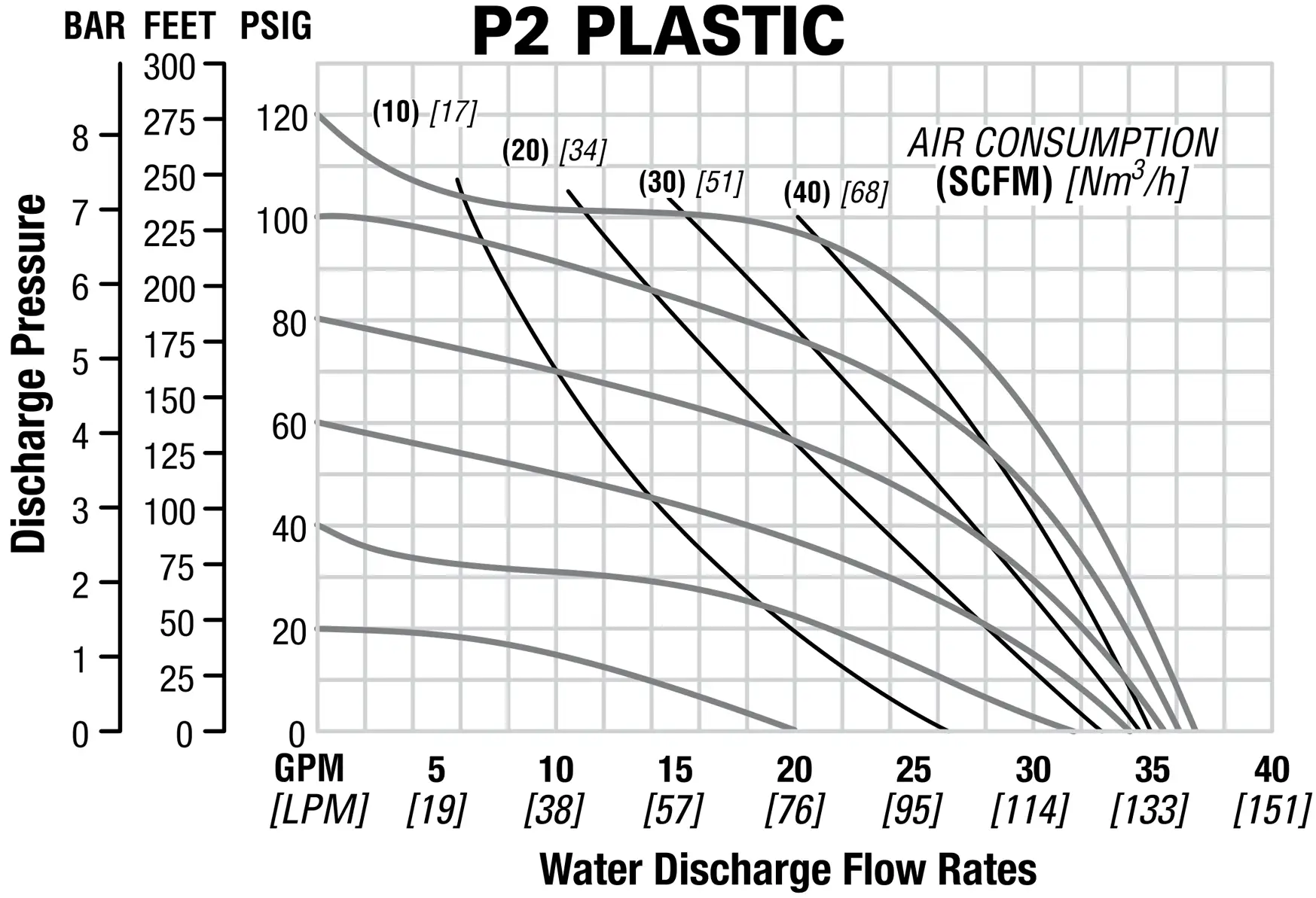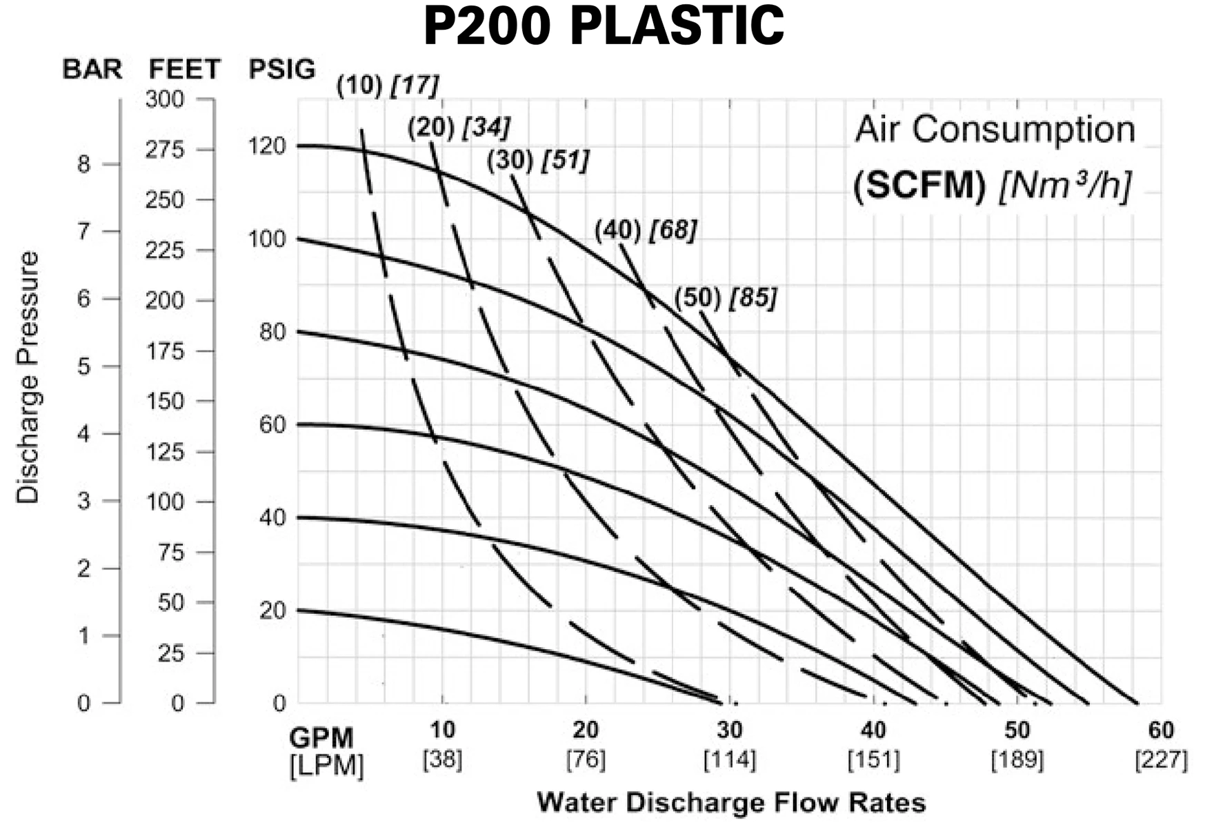 | Presión mínima de entrada de aire: | 10 psig (0.7 bar) - PTFE / 20 psig (1.4 bar) - Santoprene |